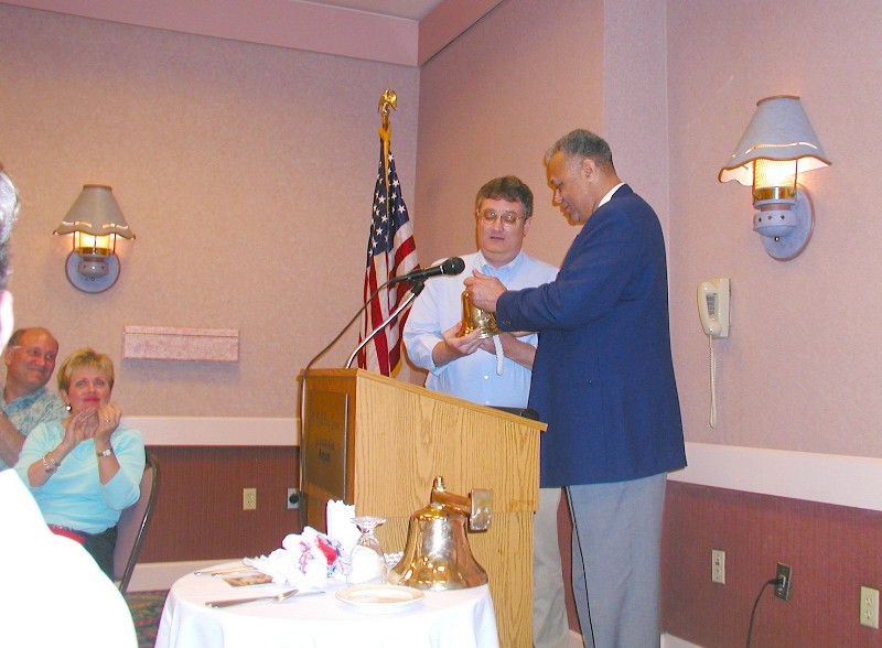 Command Master Chief Art Kelly, present Robin Smith with a gift, and engraved ship's bell, for his efforts in putting together the 30th year reunion.